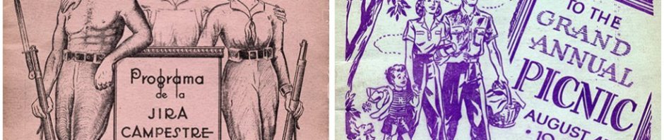 The sun is starting to set when we finally get back to the Pujazón clan. We find Kathy taking photos out of the plastic bags and organizing them on the cleared table: a color image of her grandfather dressed as a bullfighter, group portraits of the picnics from yesteryear. But what most grabs our attention are two tall stacks of colorful pamphlets on the far end of the table. Kathy points to them and says: “My grandfather collected all the printed programs of this annual picnic from the year 1936 until 1973, and now I have inherited them.” The two most visible cover pages, which belong to the programs that sit atop each of the piles, are those of 1937 and 1946. They form, by pure chance, a powerful diptych that offers a key to understanding the history of this diaspora. The first one, written in Spanish, clearly emerges from of a community that lives between the two countries, and that still has its eyes trained on Spain; the second one, in English, features a story-book family, dog included, taking confident strides –no looking back here– towards the redemption of assimilation.
