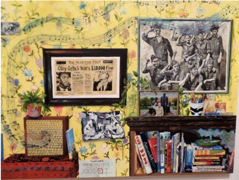 This painting was done by Celeste Dupuy-Spencer in 2016. It is in the Whitney Collection and it is titled Veterans Day. A makeshift calendar points to the importance of that day of commemoration –someone has been crossing out the days leading up to the present depicted in the painting, which is circled in red –veterans day, 2016. And yet, in the entire gallery of characters that the painting references and recreates, there is not a single officially recognized veteran to be found. A newspaper clipping memorializes Cassius Clay –later Mohammed Ali–’s momentous decision, at the peak of his boxing career, to declare himself a conscientious objector, and refuse to serve in the Viet Nam war. “I ain’t got no quarrel with the Viet Cong.” A draft-dodger being celebrated by someone who is keen on commemorating Veterans Day. A large framed photograph represents a group of Abraham Lincoln Brigade volunteers, giving the popular front salute; these brave men and women, who, as we have seen, stood up to fascism five years before Pearl Harbour, have never been granted the official status of veterans; in fact, they were eventually branded with the non-sensical label of pre-mature antifascists, and were written out of most versions of the history of “The Greatest Generation”.