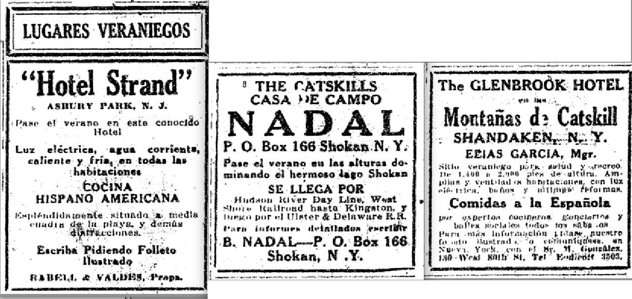 1008470_193411557488512_1894262516_oIf some Spaniards sought relief from the sweltering heat of the city by fleeing south towards the beaches of Staten Island or New Jersey, others headed north, toward the cooler and dryer air of the Catskill Mountains.  These two options appear in a July 4, 1923 ad in La Prensa, which advertises the Hotel Strand  in Asbury Park, and two vacation spots in the heart of the Catskill Mountains.