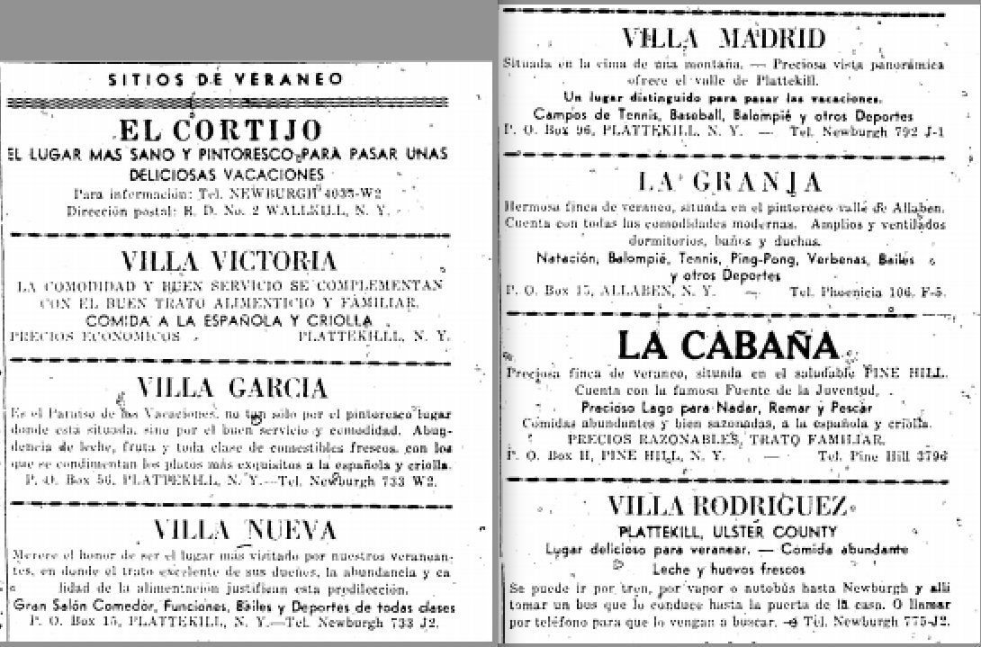 Poco antes o durante la Gran Depresión, otros españoles se habían mudado a distintos pueblos del Valle del Hudson, a unas cien millas al norte de la ciudad, donde trabajaban como agricultores en la zona de Plattekill, entre Newburgh y Kingston. Con el tiempo, algunas de estas granjas regentadas por inmigrantes españoles empezaron a recibir a huéspedes temporales –compatriotas que huían del bochornoso verano neoyorquino– y algunas se irían convirtiendo en lo que hoy llamaríamos centros de turismo rural para la colonia. En el verano de 1929, Federico García Lorca visita a Angel del Río y a Federico de Onís, que veraneaban en sendas casas en esta misma zona del Valle del Hudson; visita plasmada en varios poemas de Poeta en Nueva York. Villa Alonso, en Walkill New York, era una pequeña granja de los inmigrantes Angel Alonso y Consuelo Suárez (asturianos los dos), que alquilaban habitaciones a visitantes de la ciudad. El Hotel Rifton, establecido por Alfredo Díaz y Pilar Montes (también asturianos) contaba con casi cien habitaciones para huéspedes, y un pequeño lago con barquitos de remo. Las fotografías de grupos en estos lugares de nostalgia y hospitalidad en los “Spanish Catskills” evocan las  texturas y los vínculos de la colonia, en vísperas de su disolución; ya que tras la Guerra Civil Española, y la Segunda Guerra Mundial, y las nuevas realidades de Estados Unidos, la colonia quedaría más o menos disuelta, y las villas, ruinas de aquellos tiempos de escasez pero también de plenitud.