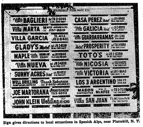 “In the 1930s hotels serving Spaniards [in the area of Plattekill, southeast Ulster County] created the largest Latino resort in the East, which peaked in the 1960s with the arrival of Cubans and Puerto Ricans, but faded after the 1970s.” –Ruth Piwonka, “Plattekill,” The Encyclopedia of New York State.