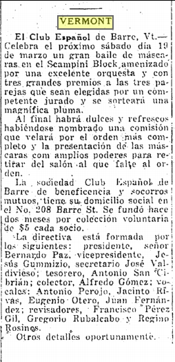 “El Club Español de Barre, Vermont.” La Prensa (NY), March 15, 1917.